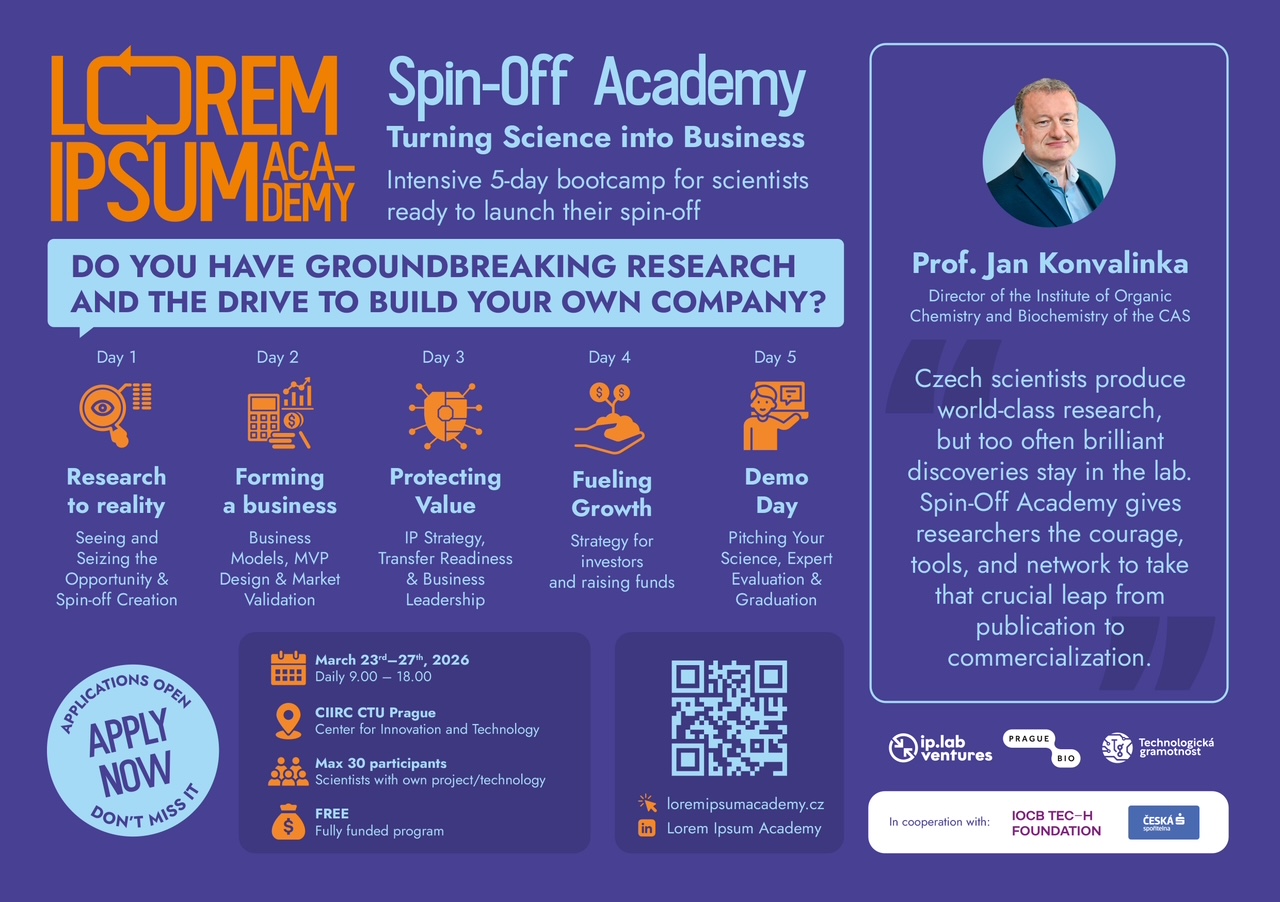 Týdenní intenzivní bootcamp (23.–27. 3.) je určen vědeckým týmům i jednotlivcům, kteří zvažují, jak posunout svou technologii směrem k trhu. Program systematicky provede účastníky klíčovými oblastmi komercializace: